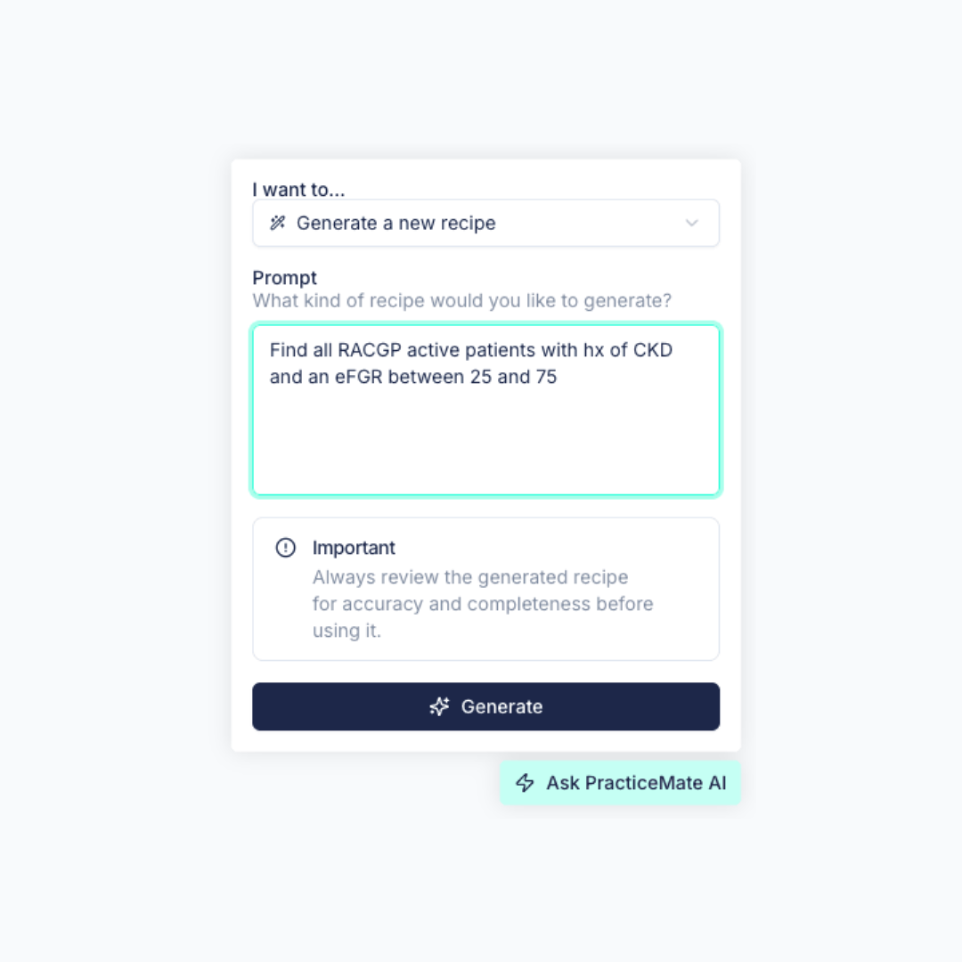 Generate recipes from natural language prompts with PracticeMate AI.